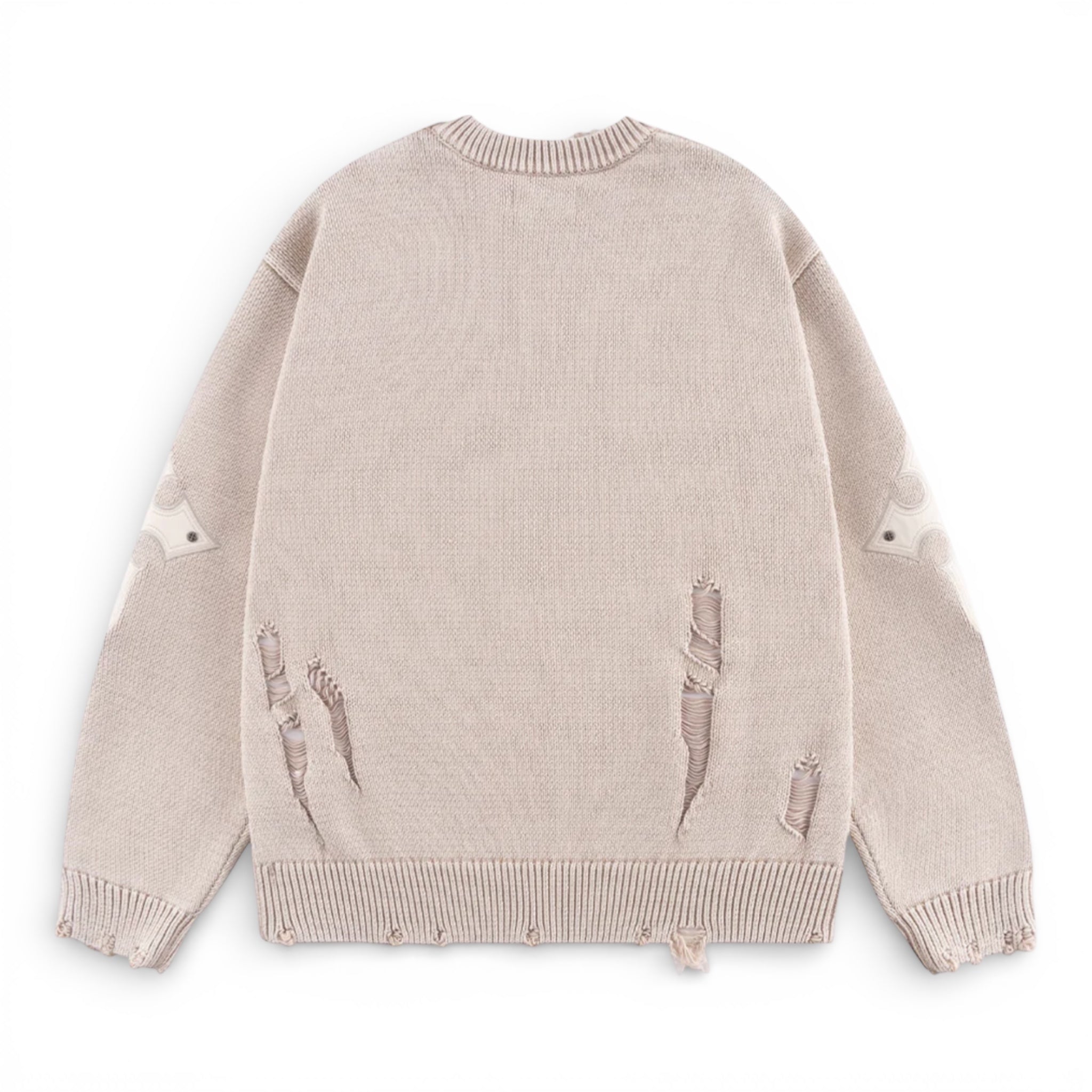 Distressed Cross Leather Patch Crew Knit Beige - Supplier Tokyo